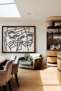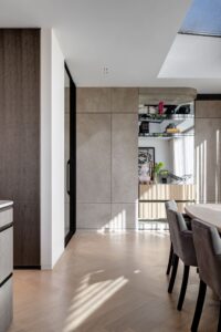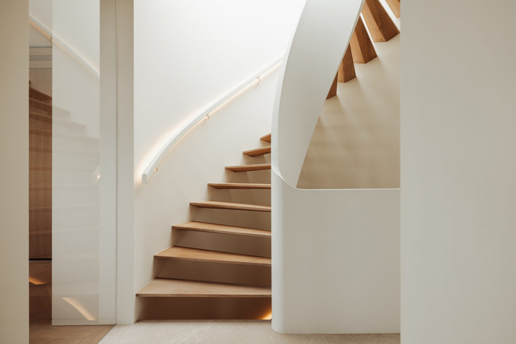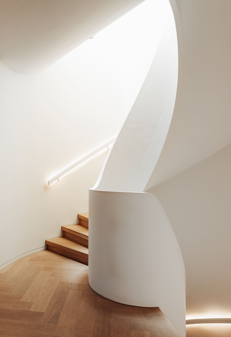 Die Sliding Box setzt auch die wunderschöne Wendeltreppe gekonnt in Szene. Diese führt von der zweiten Etage zur Dachterrasse und ist ein Blickfang im Haus. Das natürliche Licht betont die Linien der Treppe und vermittelt ein Gefühl von Weite.